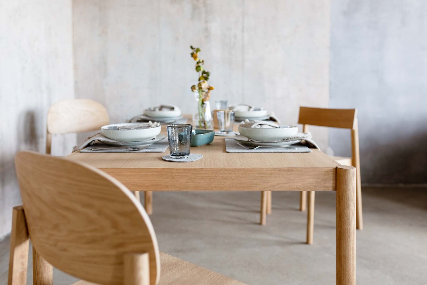 „Citizen“ valgomojo stalas išsiskiria elegantišku dizainu ir nuosaikiomis formomis. Neuždengtos cilindriškos stalo kojos atskleidžia lakonišką baldo konstrukciją bei pabrėžia dailią medžio tekstūrą. Šis valgomojo stalas yra gaminamas iš tvarių medžiagų — ąžuolo masyvo ir natūraliu medžio lukštu dengtos klijuotos faneros. Tokios pačios medžiagos naudojamos ir kuriant „Citizen“ kėdes, todėl šie valgomojo baldai puikiai dera drauge.