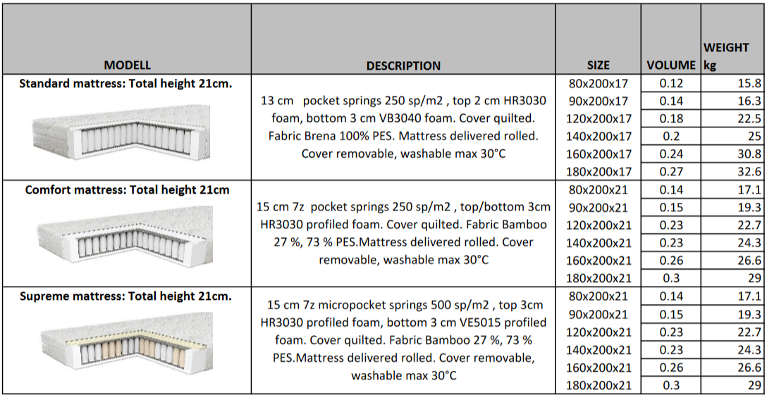 Čiužinys „Comfort“: “: bendras aukštis – 21cm. 7 zonų čiužinys pagamintas iš 15cm aukščio kišeninių spyruoklių, 250vnt/m2, padengtų iš abiejų pusių aukštos kokybės porolonu. Čiužinys yra vartomas, kietumai abejose pusėse vienodi.