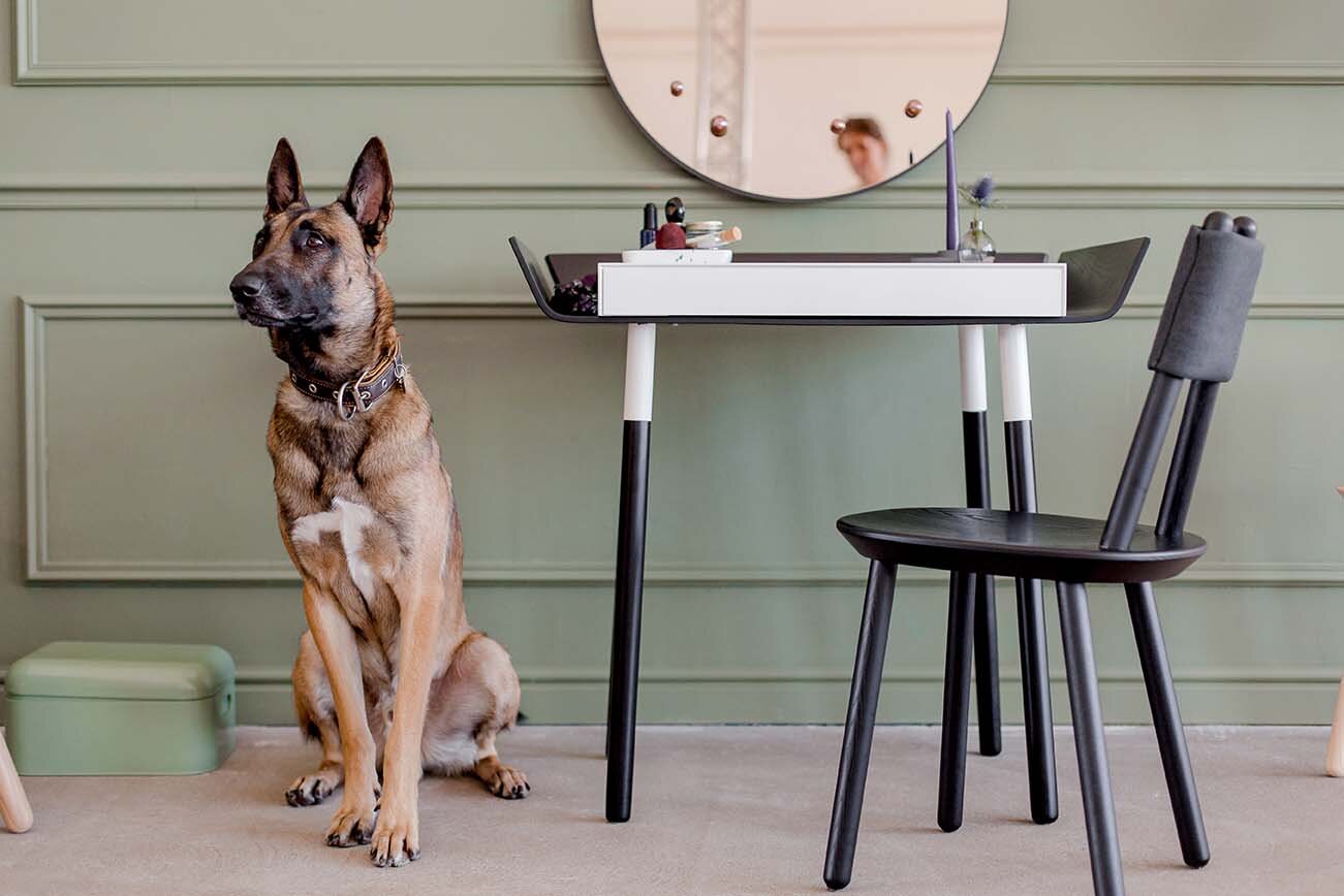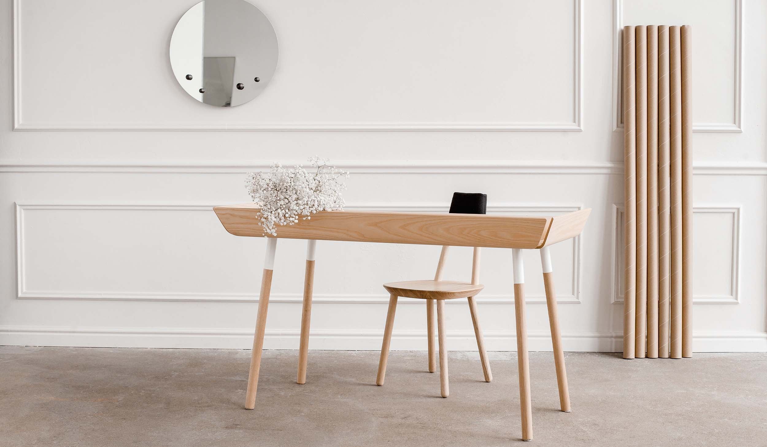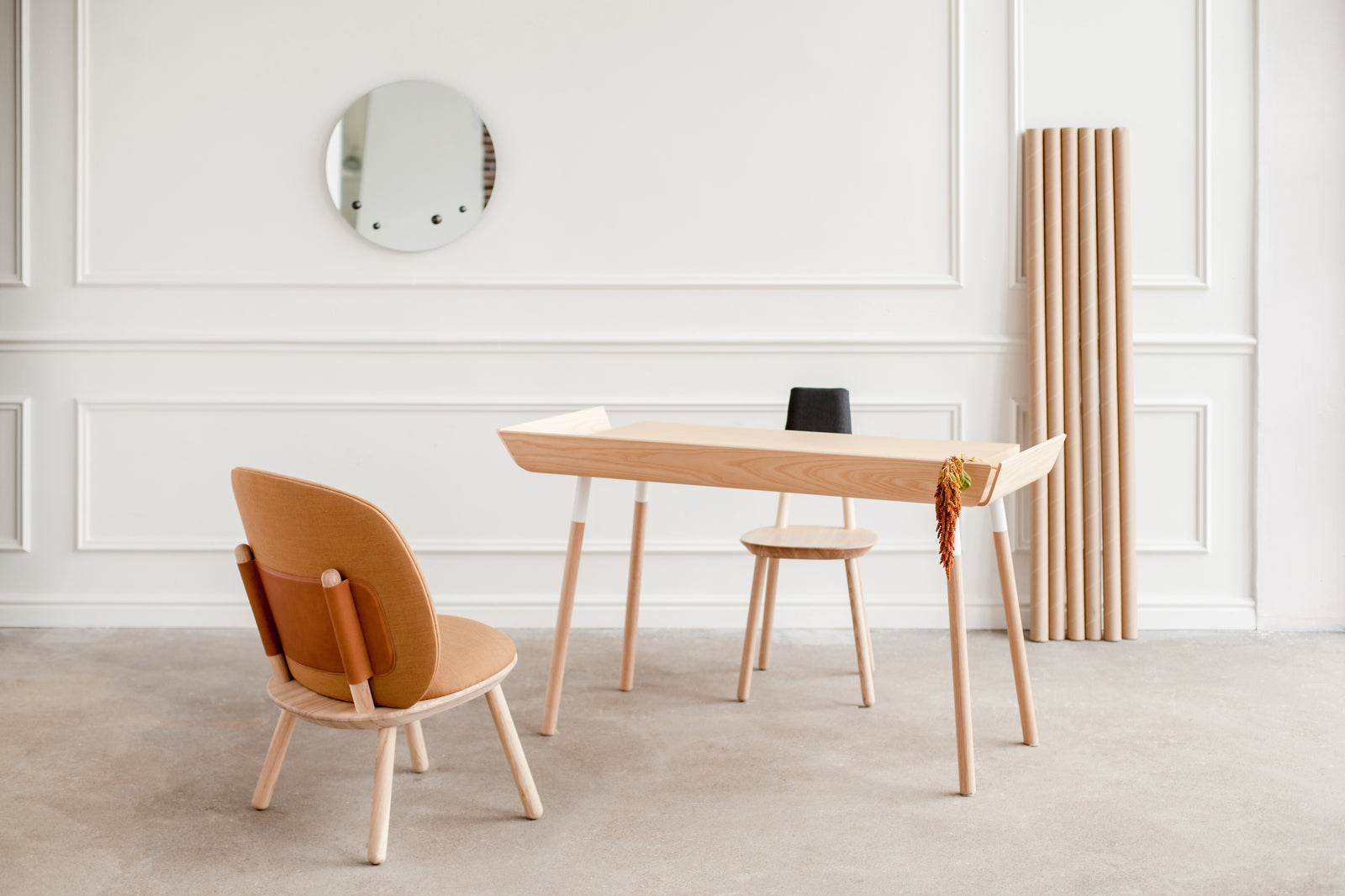 The high edges of the desk isolate it in the room and create a positive microclimate where things “feel good” in relationship to the user. The wings are divided, leaving space for electrical wires. MWD features two drawers to store a laptop and other working tools. The legs of the table can be twisted off for easier transportation. For smaller, cosier spaces, a one-drawer version was created. MWD is Inesa’s graduation project from the Vilnius Academy of Arts.